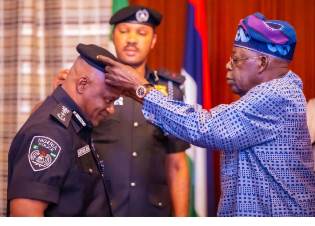 President Bola Ahmed Tinubu decorating the new Acting Inspector-General of Police.
